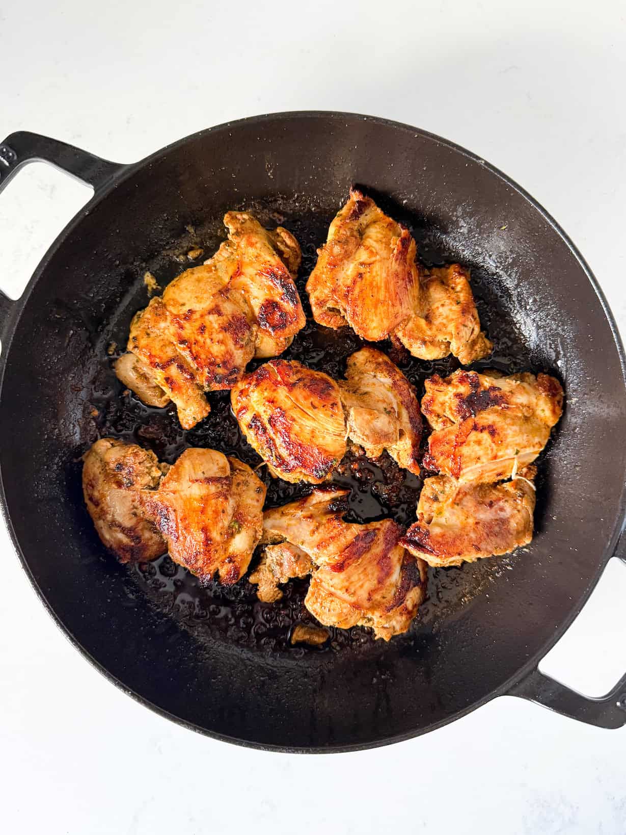 - Heat ½ tablespoon of olive oil in a large skillet over medium-high heat. The chicken will be well coated in oil, so you don’t need to add a lot to the skillet. Once the skillet is hot add the chicken thighs, smooth side down first, and cook for 6-7 minutes on both sides until the chicken is well browned and cooked through.